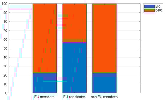 Figure 6 underlines how the share of BRI projects is higher than 50% among EU candidate countries in South-Eastern Europe, while DSR projects predominate among non-EU countries and most Western–Northern countries. Concrete examples of BRI investments include the East–West Highway Corridor in Georgia, the Budapest–Belgrade Railway in Serbia, the MINOS Solar Power Project in Greece, the Emba Hunutlu power station in Türkiye, and the Yuzhny Black Sea Port in Ukraine. Among DSR investments, it is worth mentioning 5G broadcasts in many UK cities, as well as extensive cooperation with Chinese companies such as Huawei and Alibaba in the fields of communications, information security systems, smart cities, and fintech in Germany and France. These results seem to confirm a “two-speed Europe”, as discussed in Section 2.5.