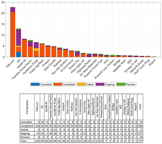 Figure 7 offers the opportunity to investigate project typologies in more detail. More than 30% of the projects concern telecommunications (i.e., telecom and 5G). Interestingly, most of the cancelled projects involved 5G, and most of the halted ones are academic programs. 5G is the most problematic category in terms of uncompleted status (i.e., halted, cancelled, or ongoing), which aligns with the analysis of Section 2.5.