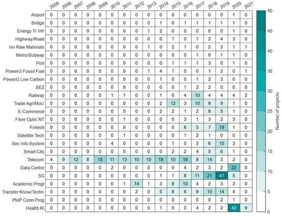Figure 9 shows that the vast majority of projects implemented before 2013 dealt with telecommunications and academic programs. 5G projects are mostly concentrated between 2016 and 2019, while the Health Silk Road projects are concentrated in the years of the COVID-19 pandemic.
