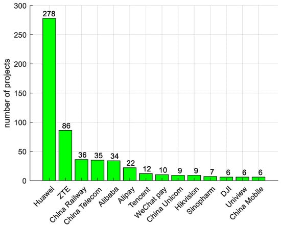 In the 727 projects taken into consideration, 148 Chinese companies/institutions were involved.18 Many companies are state-owned enterprises. Only 14 companies/institutions take part (or have taken part) in more than five projects. These 14 companies have participated in 74% of the total number of projects (541 projects in total). Huawei alone was involved in 278 projects, or 38% of the total, in line with the predominance of the DSR. This means that, despite the high number of enterprises/institutions involved in the BRI within Europe, the vast majority of projects have involved a small group of powerful enterprises/institutions (together with other enterprises in some cases), as reported in Figure 11. It is worth noting that 17 of the 19 cancelled projects involved Huawei: 1 in Portugal and 16 in the UK. Of these 17 projects, 16 concern 5G and only 1 is an academic program in the UK.