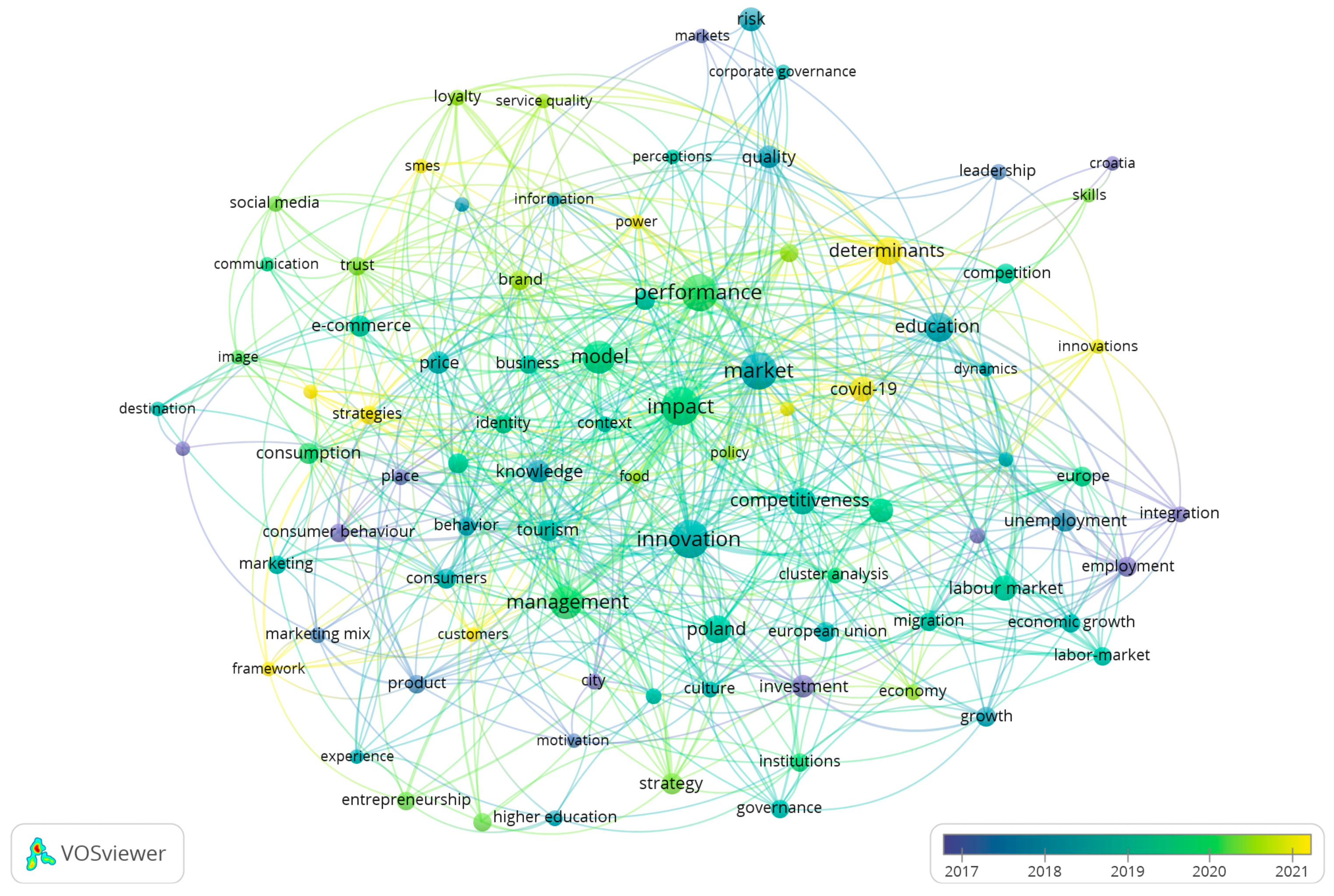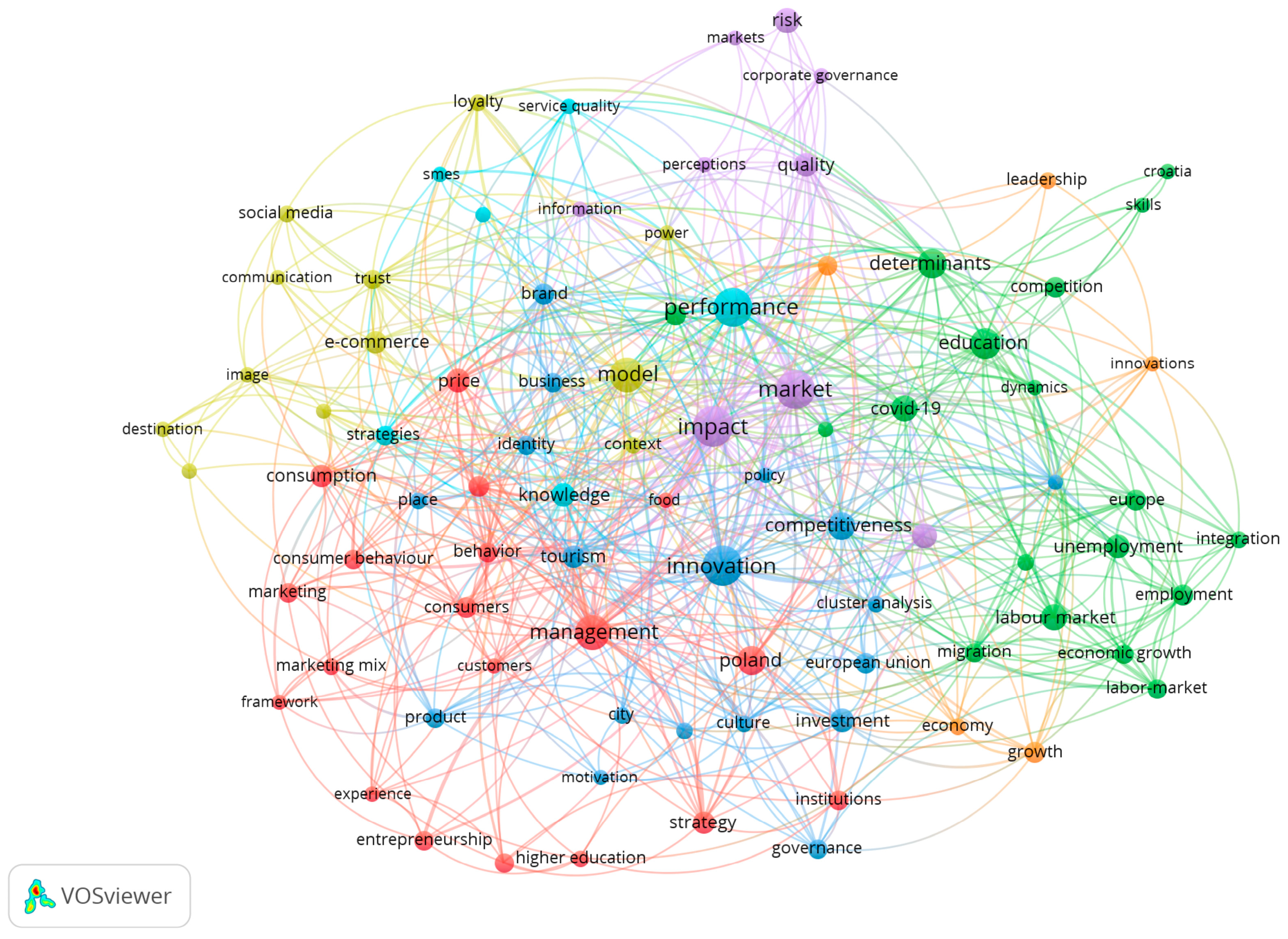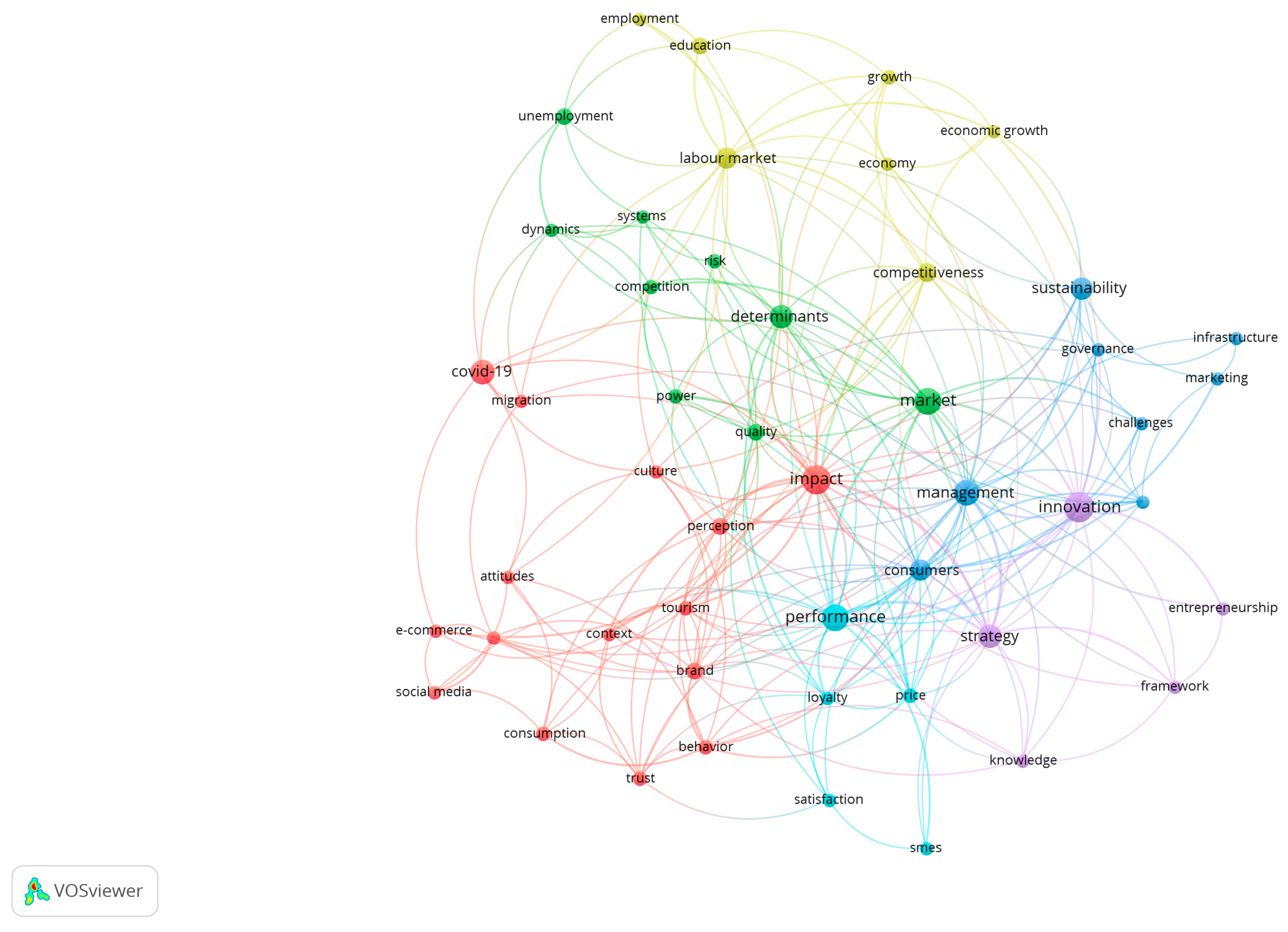 There are six clusters in the network. The first cluster (yellow cluster) covers innovation and competitiveness. Its key concepts are innovation, competitiveness, market, governance, investment, risk, and quality. This group shows the connections between economic growth, competitiveness, and innovation management. Typically, strategic and macroeconomic research is related to this cluster. The second cluster (blue cluster) deals with the analysis of performance and the economic environment. Its key concepts include performance, competition, determinants, financial crisis, growth, economy, etc. The group organised around performance shows the relationship between corporate performance, competition, financial crisis, and economic institutions. This group focuses more on the macroeconomic environment. The third cluster (green cluster) revolves around management and marketing. It includes key concepts such as management, consumers, marketing mix, price, product, etc. Here, management is linked to consumers and products from the perspective of marketing management. This cluster represents the basis of classic marketing management research. The fourth cluster (purple cluster) contains key concepts related to the labour market and social integration, such as labour market, migration, unemployment, employment, education, integration, etc. This cluster has a strong socio-economic orientation and examines the relationship between the labour market, migration, and sustainability. It is characterised by a strong social policy and employment focus. The fifth (red) cluster deals with consumer behaviour and digital communication. It includes keywords such as trust, loyalty, brand, satisfaction, social media, e-commerce, consumer behaviour, etc. This group captures the topic of digital marketing and consumer behaviour. The emergence of COVID-19 shows the latest trends and the impact of the pandemic on consumption. The last, sixth cluster (light blue) contains keywords related to local identity and branding, such as city, identity, place, tourism, satisfaction, and globalisation. This smaller cluster focuses more on local identity, city branding, and tourism. It is particularly relevant from a place marketing perspective.