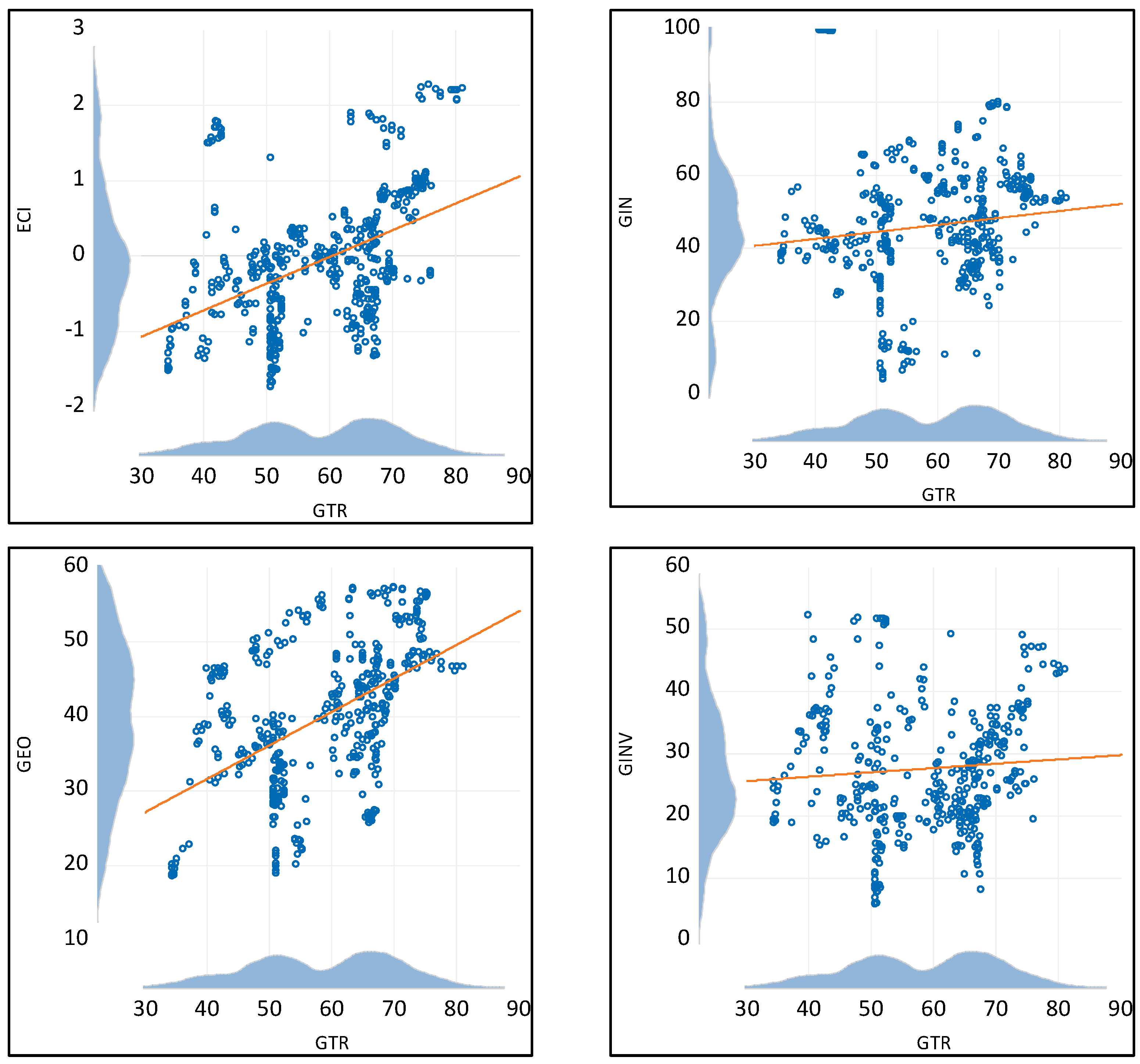 The kernel density distributions along both axes highlight the heterogeneity of the data across countries. For example, Green Trade values cluster between 40 and 70, while Economic complexity spreads widely across negative and positive values, reflecting variations in productive sophistication. Similarly, Green investment and Green innovation exhibit concentrations around mid-range values, whereas Green economic opportunities display a broader spread. These patterns confirm the presence of cross-country heterogeneity in Asia, which justifies the application of panel regression techniques to control for unobserved differences and to better capture the underlying relationships between green trade and the explanatory variables.