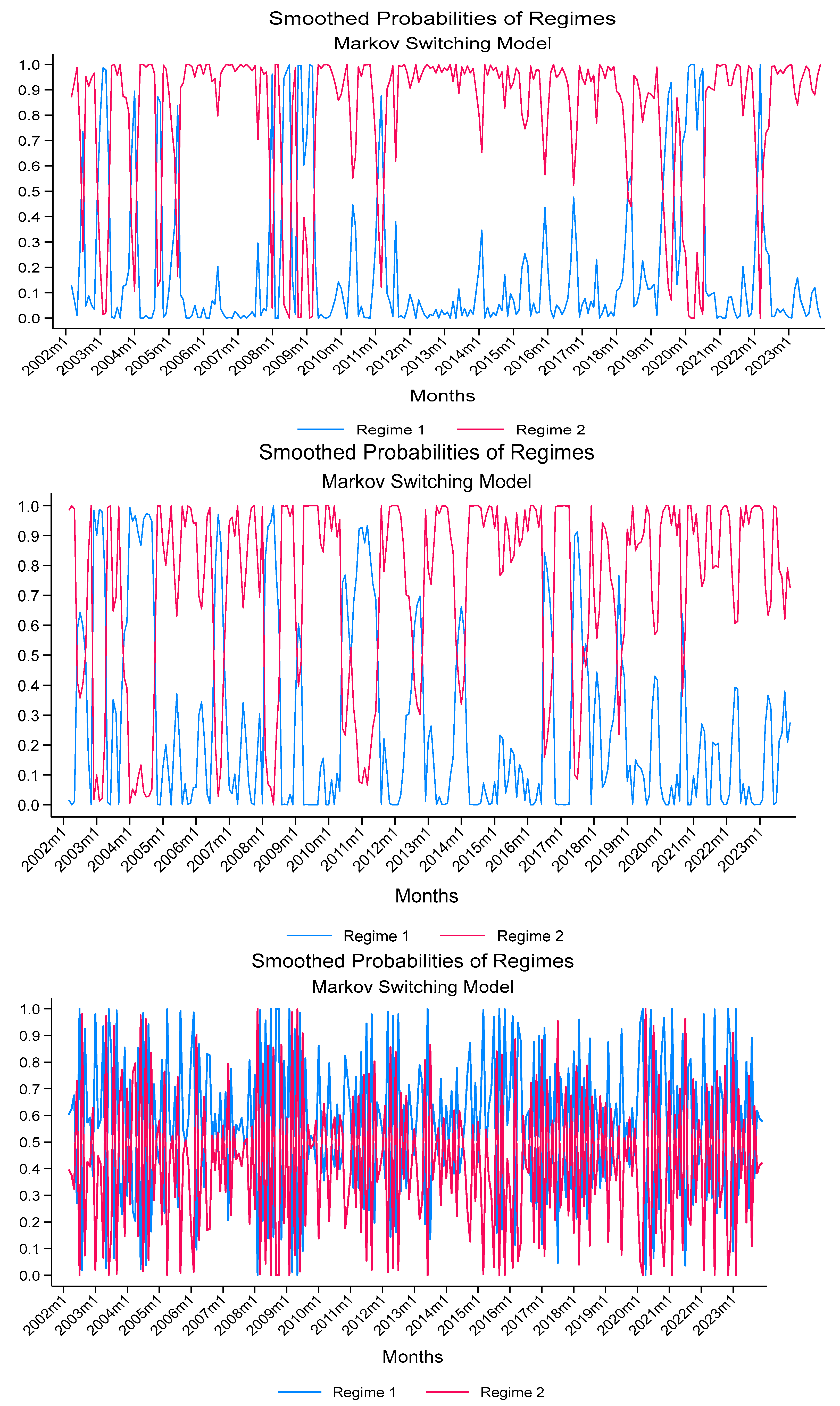 Figure 2, which presents the smoothed regime probabilities, visually confirms this persistence, showing that State 2 dominated for most of the sample period, consistent with the transition dynamics reported in