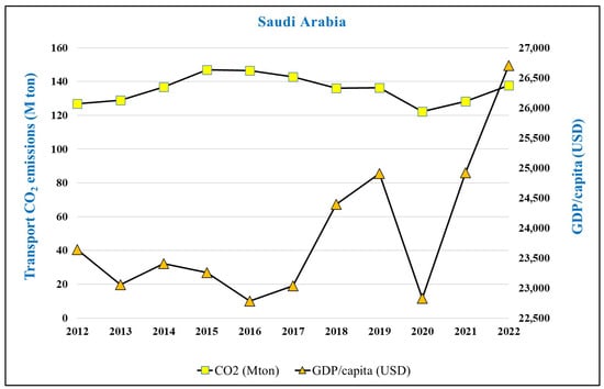 In Saudi Arabia, emissions fluctuated between 120 and 145 million tons of CO2 despite substantial changes in GDP per capita, which ranged from USD 26,000 in 2012 to nearly USD 27,000 in 2022. Following an initial rise linked to oil-driven prosperity, emissions stabilized after 2016 as the government began reforming fuel subsidies and promoting diversification under Vision 2030 (). This steady emissions profile, combined with rising income levels, indicates progress toward energy-efficient transport and partial decoupling.