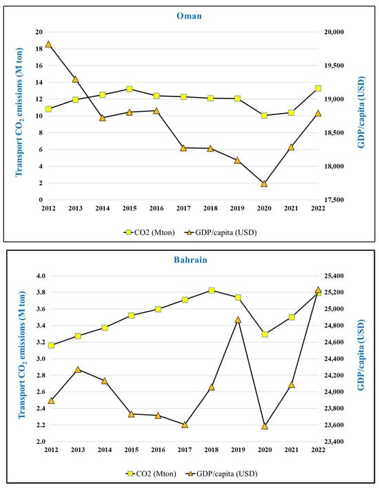 Figure 1 shows the historical trend of transport CO2 emissions and GDP/capita in the GCC countries for the period studied (2012–2022).