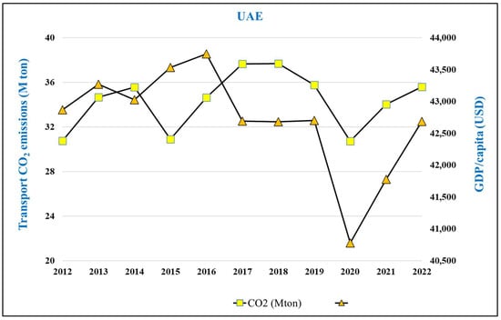 Finally, in the United Arab Emirates, transport CO2 emissions rose from 31 to 38 million tons by 2016 but later stabilized at about 35 million tons as the country advanced low-carbon transport and urban planning initiatives. GDP per capita followed a cyclical pattern, peaking near USD 43,500 and recovering to similar levels by 2022. The UAE’s steady emissions despite a strong economic recovery reflect significant decoupling driven by electric mobility, clean fuels, and urban sustainability measures under the UAE Net Zero 2050 strategy.
