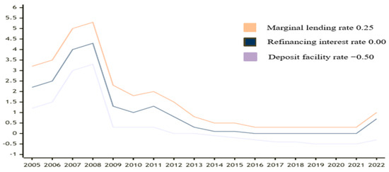 During the COVID-19 epidemic, the ECB continued its NIRP and enacted other unconventional monetary policy measures to cushion the impact of the epidemic on the Euro area economy. In March 2020, the ECB maintained the main refinancing operation (MRO) rate at 0.0%, the marginal lending facility (MLF) rate at 0.25%, and the deposit facility (DF) rate at −0.5% (Figure 1), and provided additional LTROs to support the banking system. ECB’s July 2020 forward guidance stated that it would continue to maintain very low interest rates at a level that would support the recovery of the Euro area economy.