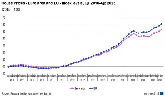 House prices, Euro area and EU aggregates; index levels, Q1 2010–Q2 2025.