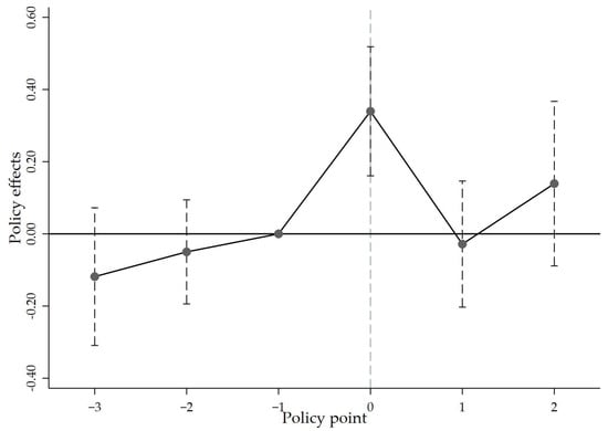 The results of the event-study test for parallel pre-trends are shown in Figure 2. The vertical dashed lines represent 95% confidence intervals, and the year prior to implementation (s = −1) is taken as the baseline period. The findings can be summarized as follows. (i) For all pre-treatment periods (s < −1), the estimated coefficients are statistically insignificant and their confidence intervals encompass zero, indicating no systematic differences in income trends between the treated and control groups before the policy. (ii) A joint significance test of all pre-treatment event-time dummies yields F = 0.48 (p = 0.6194), which fails to reject the null hypothesis of parallel pre-trends. (iii) As an additional robustness check (as can be seen in Table 3), regressions restricted to pre-policy years including covariates are performed. The joint test of covariate–year interactions (F = 1.43, p = 0.2388) also shows no significance, providing further support that the assumption of parallel pre-trends is not violated.