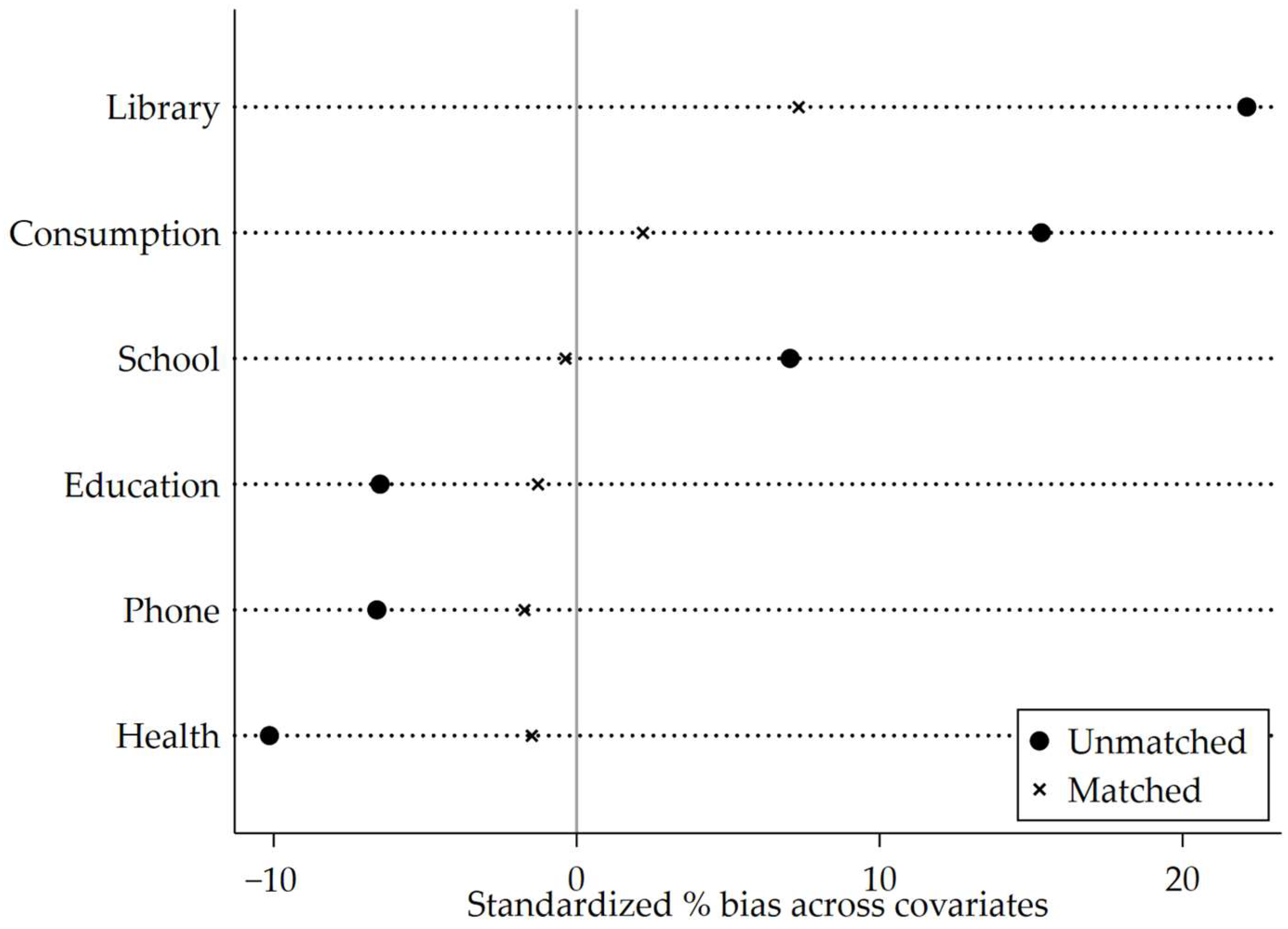 - Control Variables: To improve the regression model’s ability to explain things and make sure it is strong, controls are included at both the regional and household levels. Regional-level controls include: per capita social consumption (Consumption), which shows how developed the economy is; the number of higher education institutions (School), which shows how many resources are available for education; the number of mobile phone users (Phone), which shows how digitalized the region is; and public library collections (Library), which show how much cultural infrastructure there is. At the household level, controls include the head of the household’s years of schooling (Education) and health status (Health), which show their human capital and physical condition, respectively.