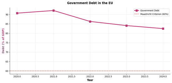 Figure 1 and Figure 2 reflect the time trend for the period of 2020–2024. They track the development of key fiscal indicators during the implementation of the RRF. Figure 1 shows the relationship between the government deficit, as an average size in the EU, and the cumulative RRF disbursements as a percentage of GDP. Figure 2 shows the trend of government debt (% of GDP) relative to the Maastricht criterion threshold (60%).