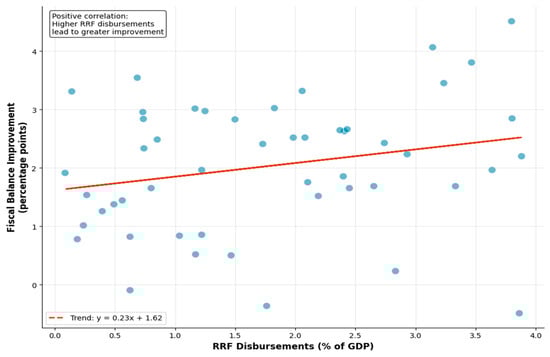 The scatter plot in Figure 3 presents the study of the correlation between RRF disbursements as a % of GDP and the improvement in fiscal balance, measured in percentage points. Each point represents a country–year observation, with a trend line showing the relationship. The correlation coefficient r was 0.238, indicating a weak-to-moderate correlation. The trend equation y = 0.23x + 1.18 suggests that every additional percentage point of GDP in RRF disbursements was associated with a 0.23 percentage point fiscal improvement. Based on the calculations, it is observed that higher disbursements were associated with a smaller or positive deficit, corresponding to an improvement. The scatter plot shows significant variations from the trend, reflecting the influence of other factors affecting fiscal outcomes, but a significant reduction in the average deficit was still observed after the launch of the mechanism, supporting its positive influence. The observed positive, but relatively weak, relationship between RRF spending and the improvement of the fiscal balance is due to the different speed of absorption of funds, as well as clear structural differences between countries. In practice, the equation shows that for every 1 percent more funds under the plan, the fiscal balance improved by 0.23 percent. A key point justifying the low value is the fact that the mechanism was indirect, and the funds were grants that were mainly directed to various types of investments, and not to the budget. The effect of the investments appeared with a time delay and cannot be reflected in the relevant year. Another key factor was the differences in the budgetary rules between countries.