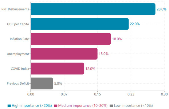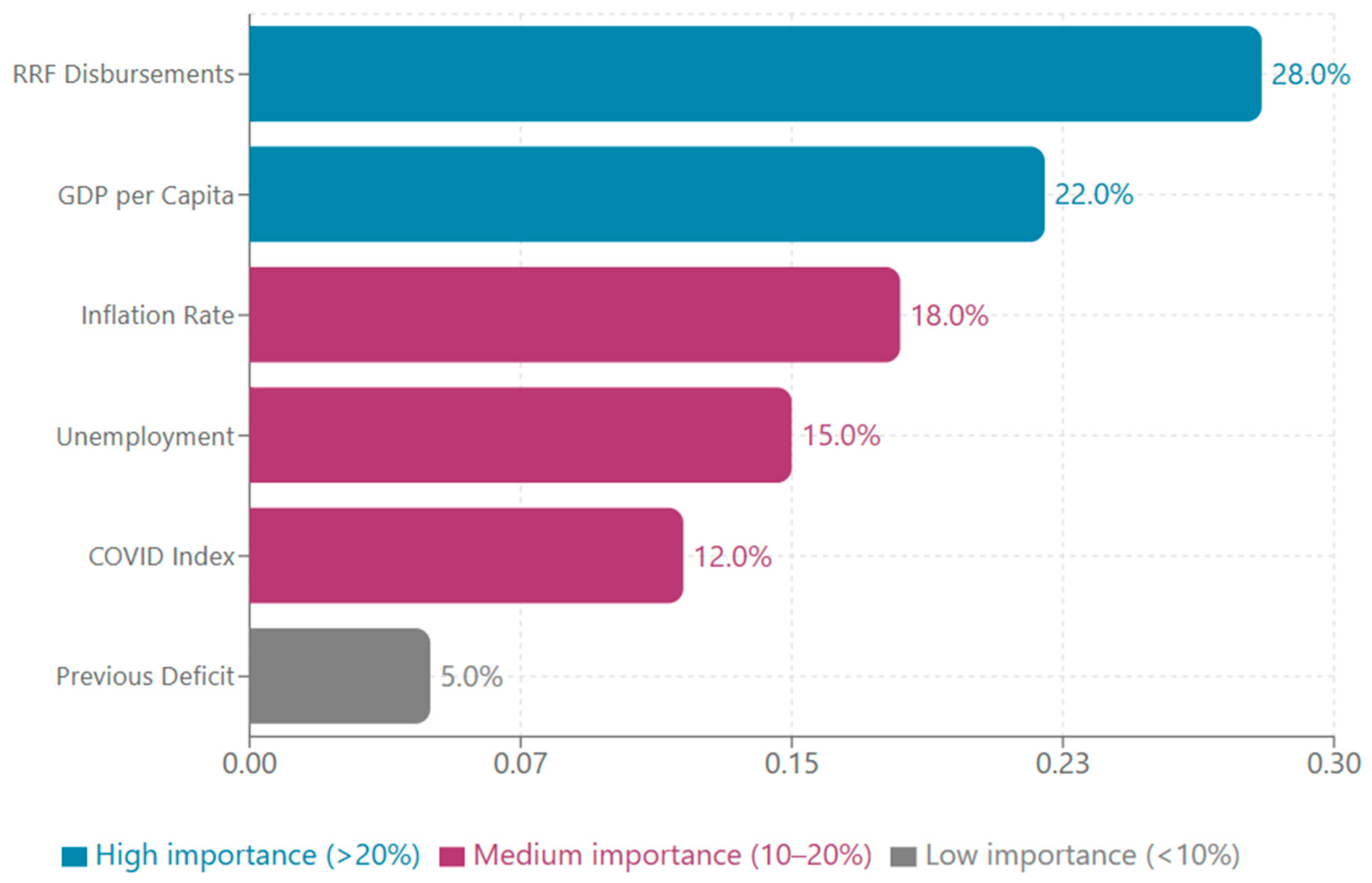 Figure 4 shows the relative importance of the different variables in predicting fiscal outcomes, applying the machine learning model “random forest regression”. RRF fund allocations emerged as the most important predictor (28%), followed by GDP per capita (22%), inflation (18%), unemployment (15%), the COVID-19 index (12%), and previous deficit (5%). The color coding highlighted variables with high importance (>20% in blue), medium importance (10–20% in purple), and low importance (<10% in gray). From the data obtained, it was observed that RRF fund allocations were a dominant factor that exceeded the values of traditional macroeconomic factors. It is reasonable to mention that political interventions under the RRF are more influential than structural factors. The second most important measure, GDP per capita, showed that rich countries have better fiscal results, and, in practice, the RRF works best on the basis of a strong economy. The macroeconomic factors of inflation and unemployment showed that their higher size leads to a worse fiscal balance. The impact of COVID-19 was significant, but not dominant, during the period. The size of the deficit was a weakly vulnerable variable, with relatively weak fiscal inertia. The RRF allows for a “fresh start”, based on political will, without taking into account previous periods.