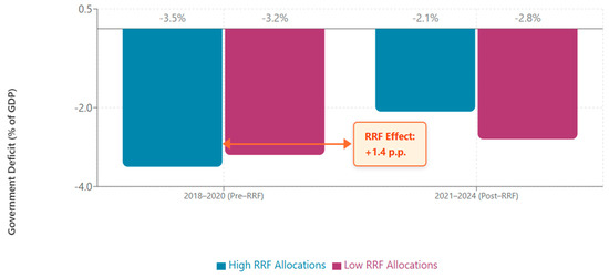 Countries with high allocations under the Recovery and Resilience Facility showed a 1.4 percentage point (Table 7) greater improvement in their fiscal deficit compared with countries with low allocations (from −3.49% to −2.09% versus −3.21% to −2.79%). This effect was highlighted as an RRF Effect of +1.4%, representing the causal impact of the program, taking into account general trends over time. Countries that received RRF payments showed a statistically significant improvement in their deficit, with the effect being strong and positive.