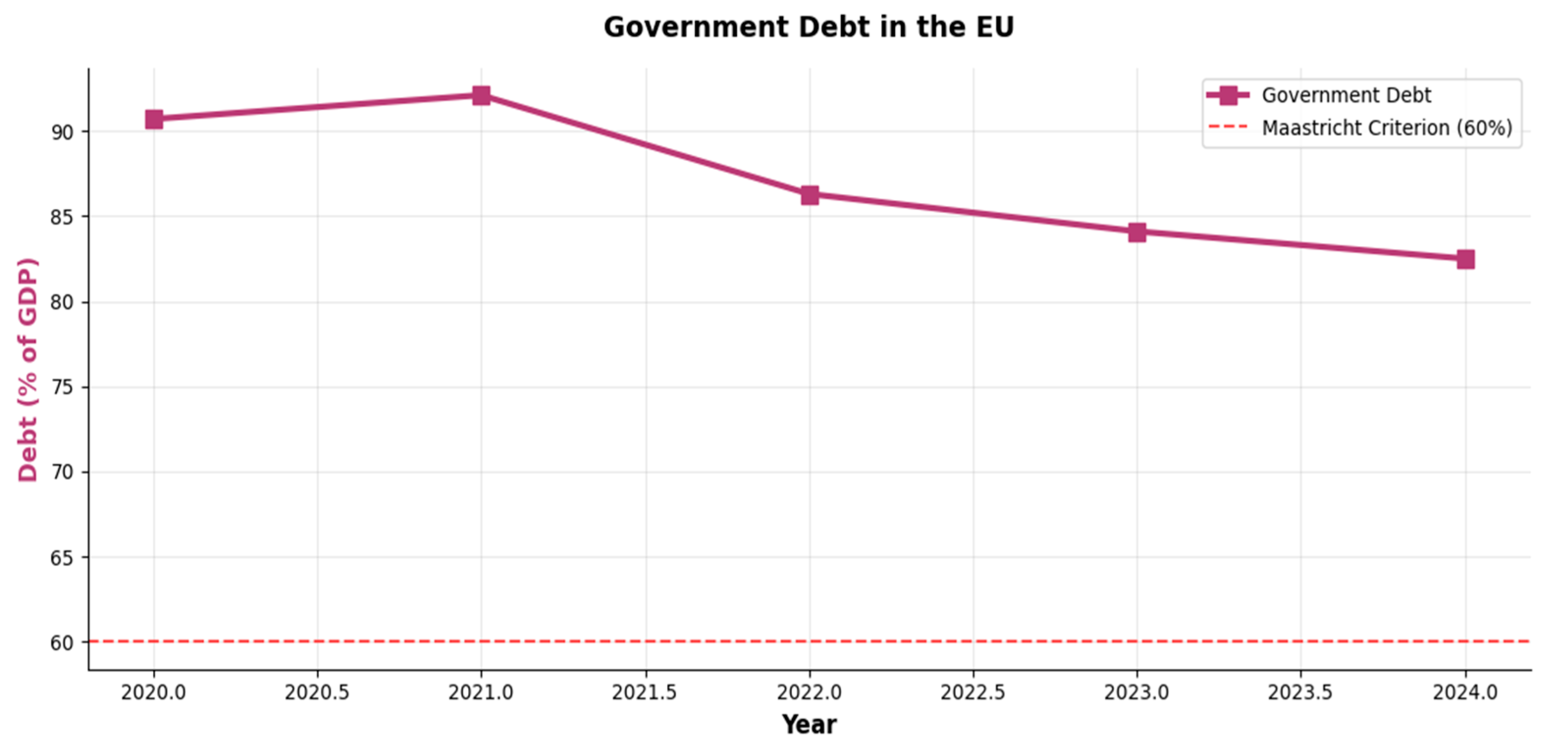 Figure 2 shows the trend of government debt (% of GDP) relative to the Maastricht criterion threshold (60%).