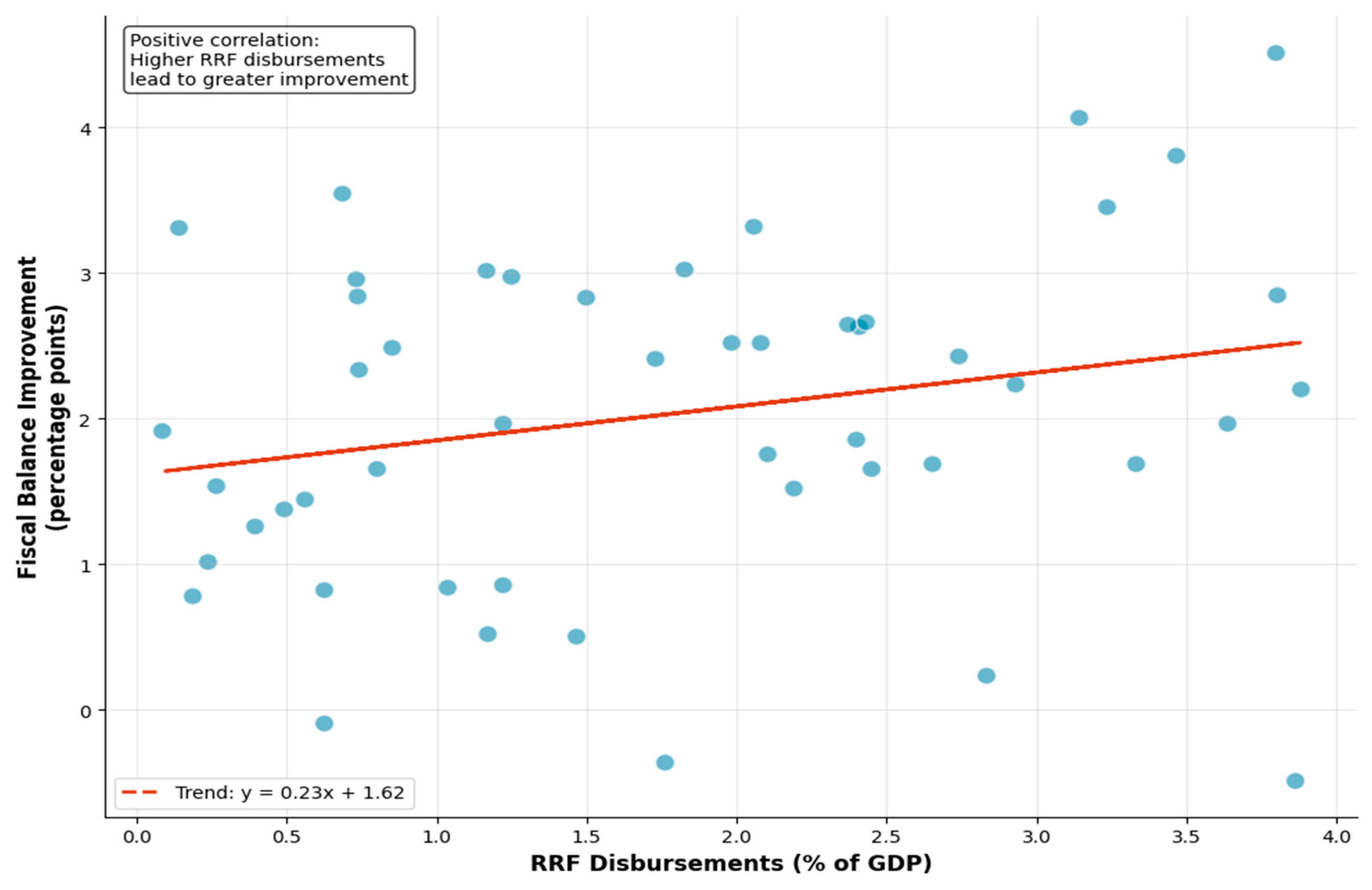 Figure 3 presents the study of the correlation between RRF disbursements as a % of GDP and the improvement in fiscal balance, measured in percentage points. Each point represents a country–year observation, with a trend line showing the relationship. The correlation coefficient r was 0.238, indicating a weak-to-moderate correlation. The trend equation y = 0.23x + 1.18 suggests that every additional percentage point of GDP in RRF disbursements was associated with a 0.23 percentage point fiscal improvement. Based on the calculations, it is observed that higher disbursements were associated with a smaller or positive deficit, corresponding to an improvement. The scatter plot shows significant variations from the trend, reflecting the influence of other factors affecting fiscal outcomes, but a significant reduction in the average deficit was still observed after the launch of the mechanism, supporting its positive influence. The observed positive, but relatively weak, relationship between RRF spending and the improvement of the fiscal balance is due to the different speed of absorption of funds, as well as clear structural differences between countries. In practice, the equation shows that for every 1 percent more funds under the plan, the fiscal balance improved by 0.23 percent. A key point justifying the low value is the fact that the mechanism was indirect, and the funds were grants that were mainly directed to various types of investments, and not to the budget. The effect of the investments appeared with a time delay and cannot be reflected in the relevant year. Another key factor was the differences in the budgetary rules between countries.
