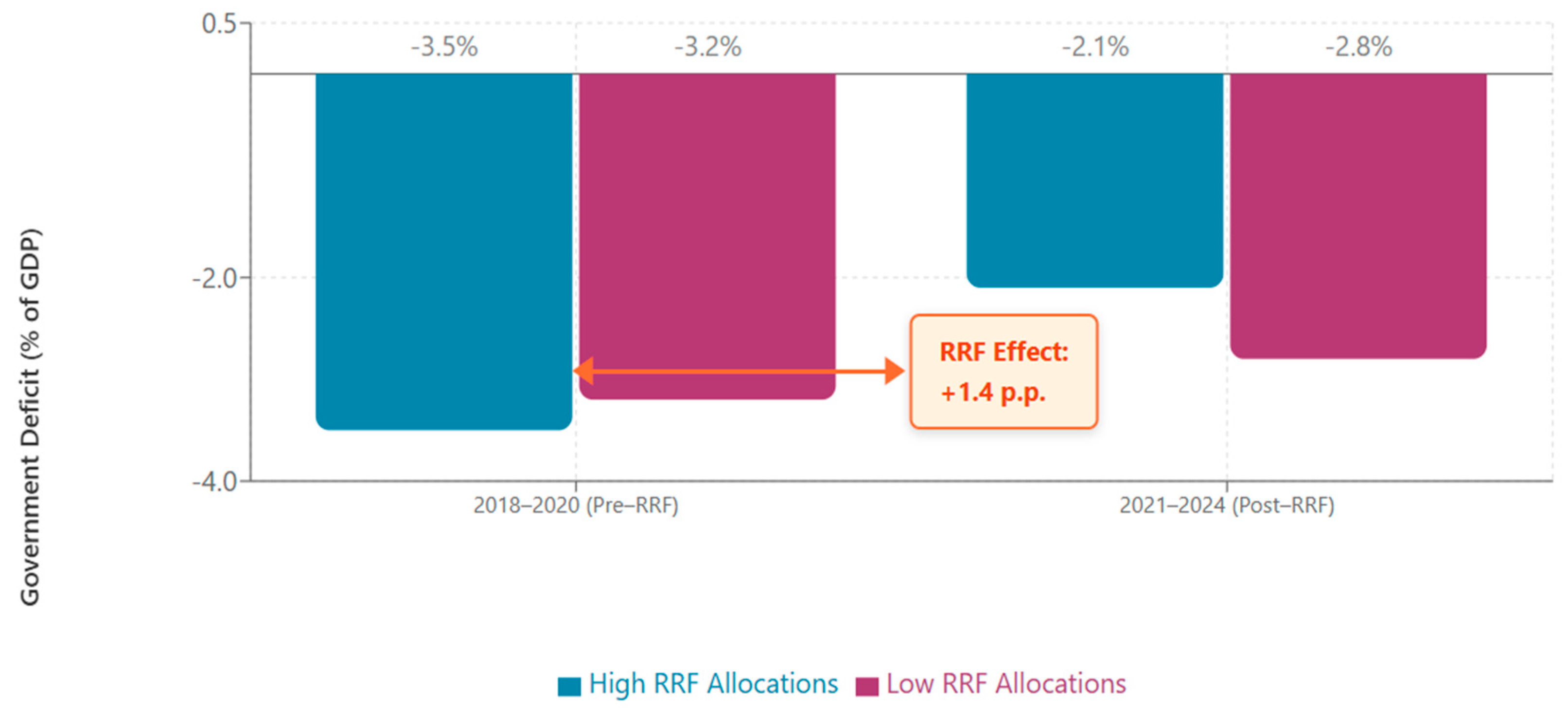 Table 7) greater improvement in their fiscal deficit compared with countries with low allocations (from −3.49% to −2.09% versus −3.21% to −2.79%). This effect was highlighted as an RRF Effect of +1.4%, representing the causal impact of the program, taking into account general trends over time. Countries that received RRF payments showed a statistically significant improvement in their deficit, with the effect being strong and positive.
