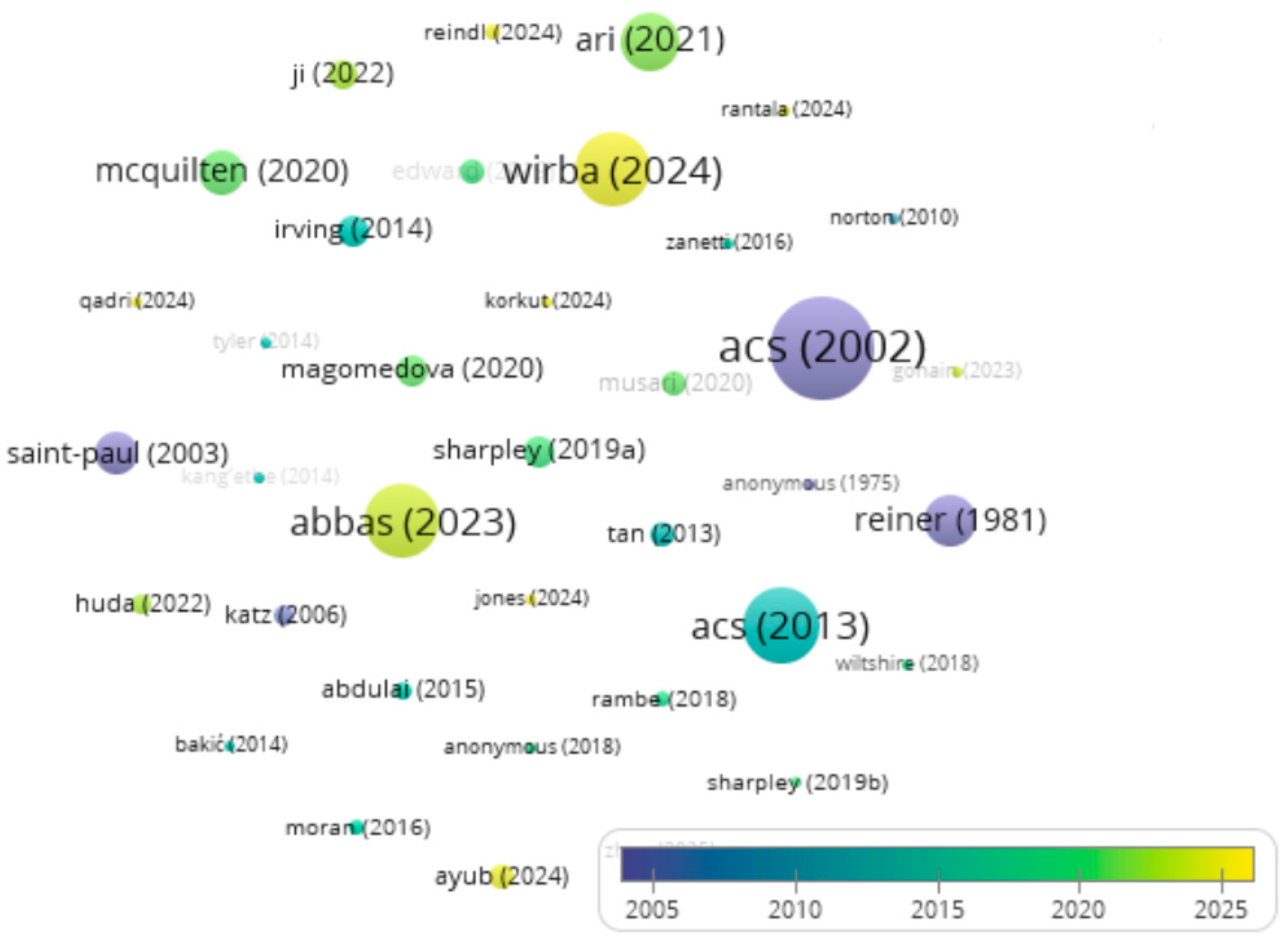 Of the 37 documents that were surveyed, 23 had received at least one citation. The earliest publication, by Acs and Phillips (2002), was dedicated to “Entrepreneurship and Philanthropy in American Capitalism,” clearly dominated the field, and represented a necessary cognitive step for subsequent studies. One of the two authors, Acs, later published a 2013 study in which he investigated the motivations behind philanthropy, including latent ones, and evaluated its economic effects. This second document was also highly cited, although significantly less than the first. All the other, less-studied contributions followed. The bibliographic framework is mapped in Figure 5, where the size of each node indicates the number of citations, and the colours refer to the year of publication.