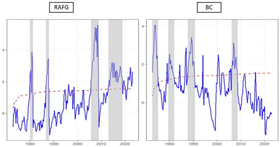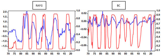 This section presents the results of the RADF test, which was used to examine the null hypothesis of unit roots against the alternative hypothesis of explosive behaviour across the entire sample. The results are displayed in Table 2. In the table, a rejection of the null hypothesis in favour of the alternative is indicated when the -statistic exceeds both the Monte Carlo critical values (RTMC) and the right-tail tabulated critical values (Tab). RFAG refers to the real-financial activity gap, while BC refers to the business cycle or the output gap.
