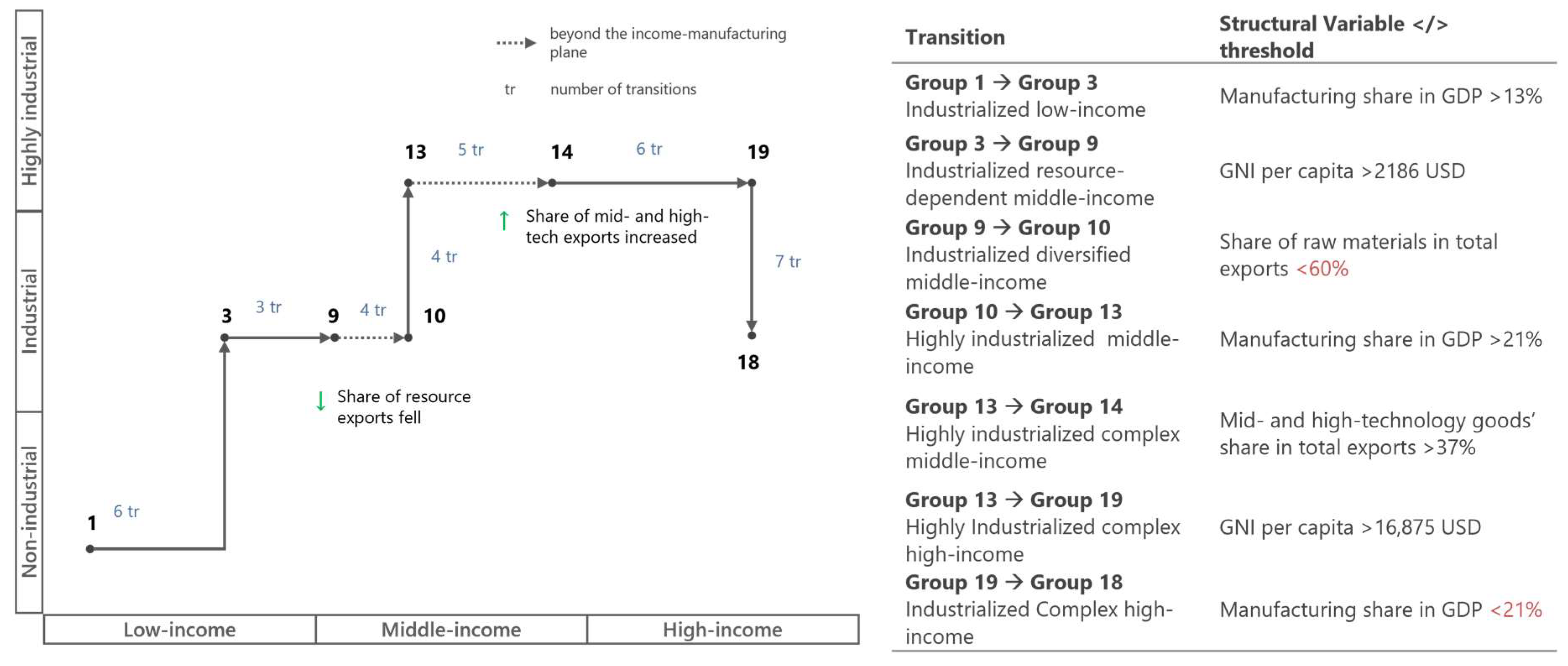 Figure 4 the resource-export path. In each figure, the vertical axis denotes manufacturing intensity, and the horizontal axis denotes income category. Solid lines indicate observed transitions; dashed lines indicate movements beyond the income–manufacturing plane. The right-hand panel lists group names and the thresholds used to define transitions.
