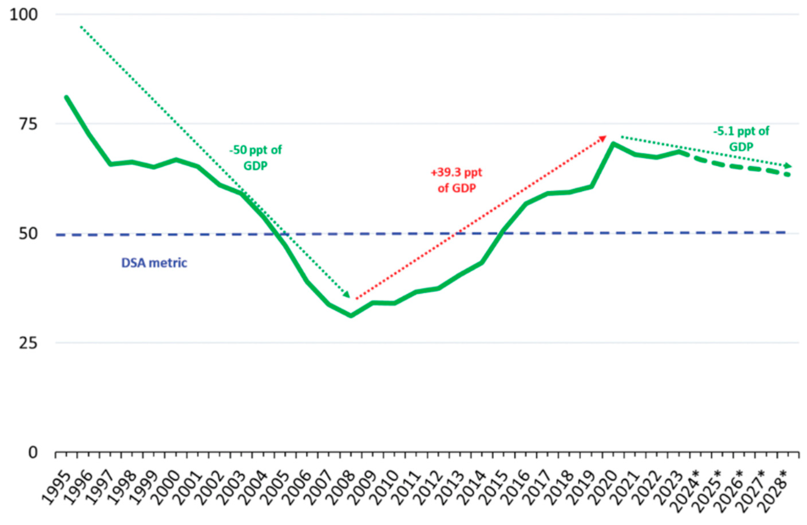 - Kitutila, Y. W. (2024). Estimation of the public debt threshold effects on economic growth in sub Saharan African countries. African Development Review, 36(2), 377–390. [Google Scholar] [CrossRef]