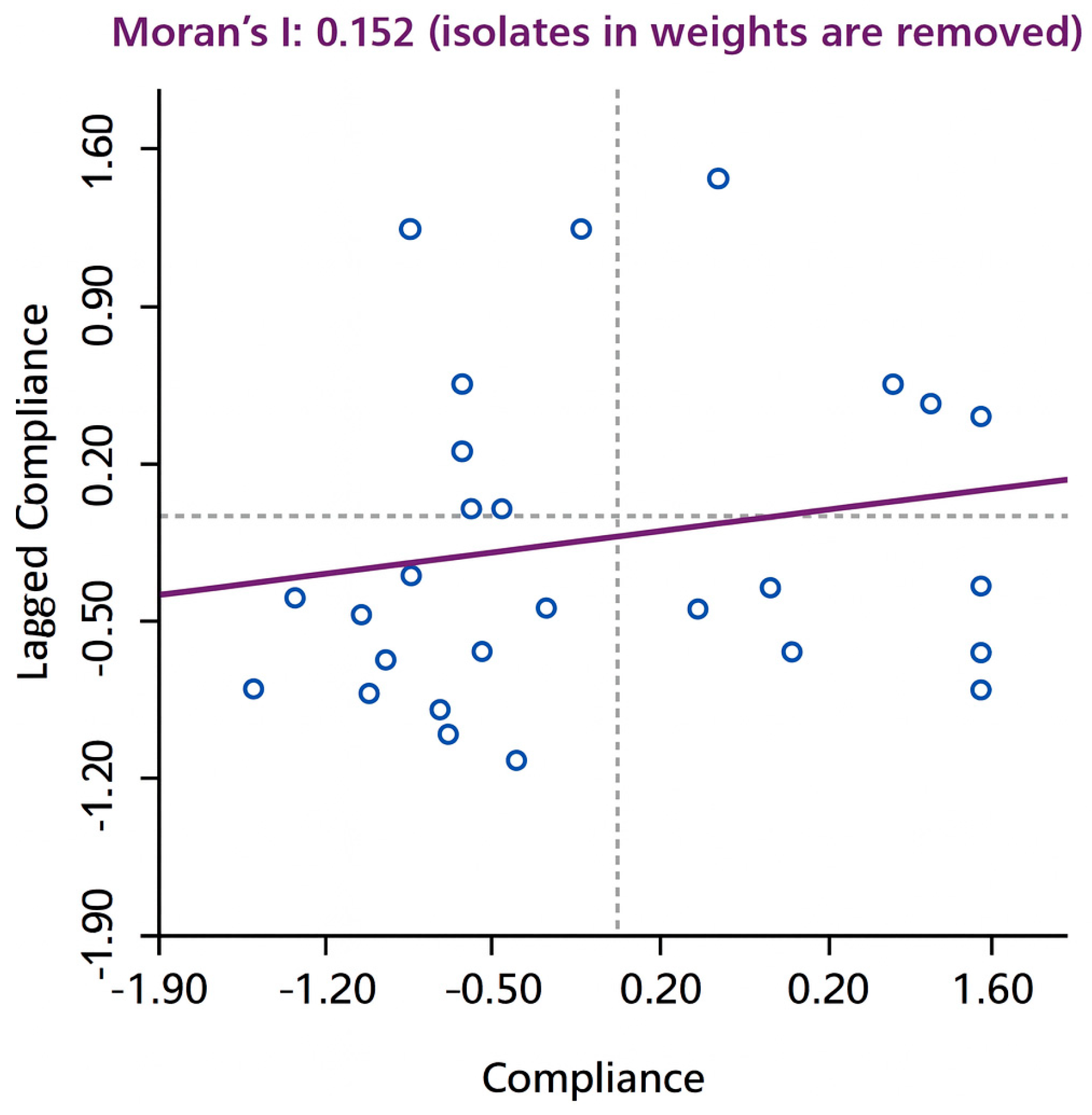 The spatial clustering results—identifying High–High, Low–Low, and Low–High categories—inform the interpretation of compliance disparities across provinces.