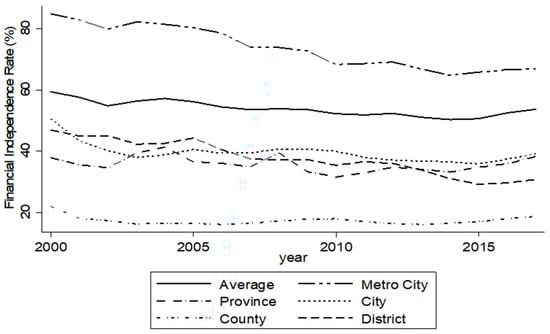 Descriptive statistics for 2000–2017 reveal substantial variations in financial independence across different types of local governments. Financial independence is typically measured as the ratio of own-source revenue to total general account revenue. Over the study period, the average financial independence rate for all local governments was approximately 54%, with metropolitan cities (including the special metropolitan city) recording around 73%, and provincial governments approximately 36%. Among basic local governments, the average financial independence rate was approximately 40% for cities, 17% for counties, and 38% for districts, indicating that basic local governments, particularly counties, rely much more heavily on transfers than metropolitan governments. These patterns highlight the relatively limited dependence on own-source revenue among many basic local governments (see Figure 1).
