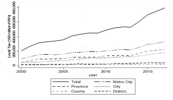 The evolution of local tax revenue over time shows marked expansion. All figures reported in this section reflect nominal values, unless otherwise stated. Between 2000 and 2017, the total local tax revenue increased by approximately 290%, reaching approximately 79.8 trillion KRW 2017. Growth rates differed across government types; provincial taxes increased by approximately 414% during this period, city taxes increased by approximately 326%, and metropolitan taxes increased by approximately 251%. In 2017, metropolitan taxes accounted for around 42% of total local tax revenue (33.1 trillion KRW), followed by provincial taxes at 28% (22.5 trillion KRW), city taxes at 22% (17.8 trillion KRW), district taxes at 5% (4.2 trillion KRW), and county taxes at 3% (2.2 trillion KRW). These figures indicate that while local tax revenues have grown substantially, the tax base of basic local governments—cities, districts, and counties—remains relatively modest compared to that of metropolitan governments (see Figure 2).