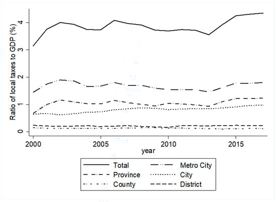 Local tax revenues also increased relative to the size of the national economy. The ratio of total local taxes to gross domestic product (GDP) increased from approximately 3.1% in 2000 to 4.3% in 2017, indicating a gradual upward trend in the local tax share of GDP over the period. During these years, the contribution of metropolitan, provincial, city, county, and district taxes to the total local tax/GDP ratio have differed, with metropolitan and provincial taxes accounting for the largest proportion (see Figure 3).