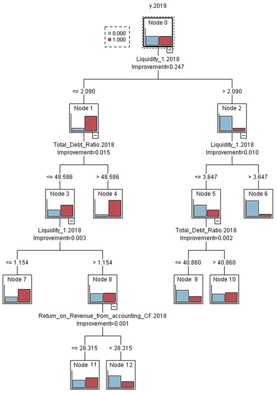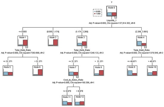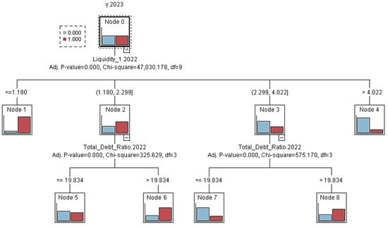 In Table 5, which reflects the post-pandemic period, results indicate a partial recovery in performance for most methods. The CHAID model achieved the highest accuracy, confirming its strong overall balance. The CART model achieved the highest sensitivity and maintained a close accuracy. The neural network performed competitively across all metrics, maintaining stable accuracy. Logistic regression achieved the lowest sensitivity yet still yielded a relatively high AUC. The C5.0 tree delivered solid results, and discriminant analysis improved compared with the pandemic period but remained the least effective, particularly in identifying distressed firms. When ranking the models based on all their evaluation measures, the CHAID model should be considered the one with the highest predictive performance. Therefore, Figure 5 presents the CHAID model for the post-pandemic period.