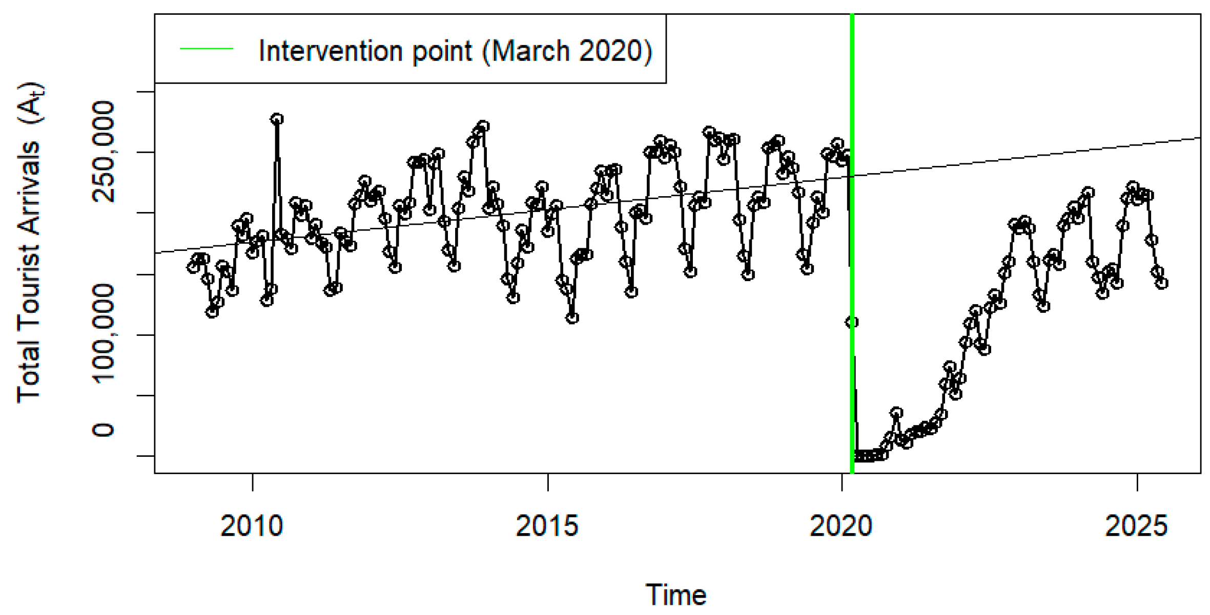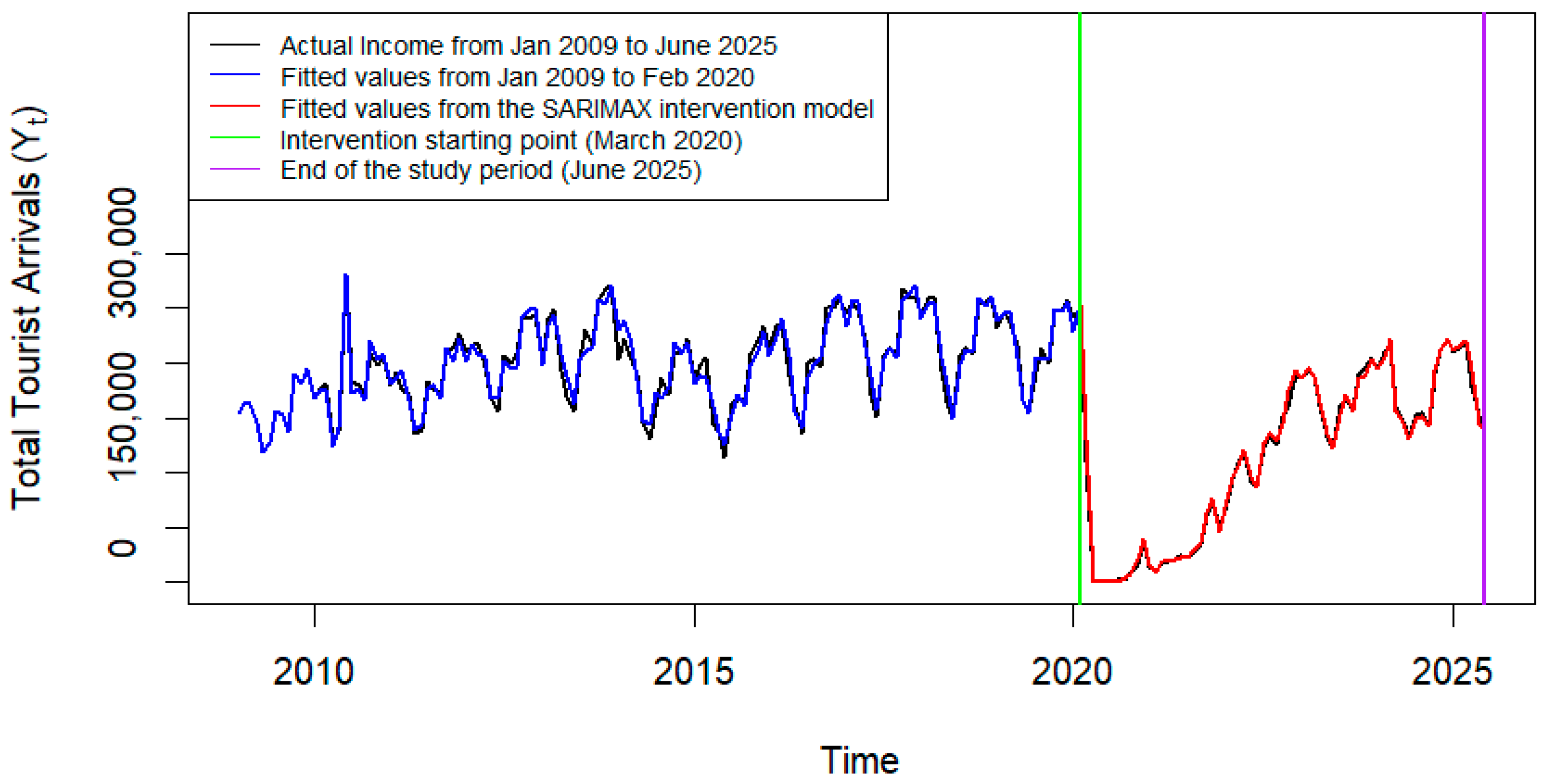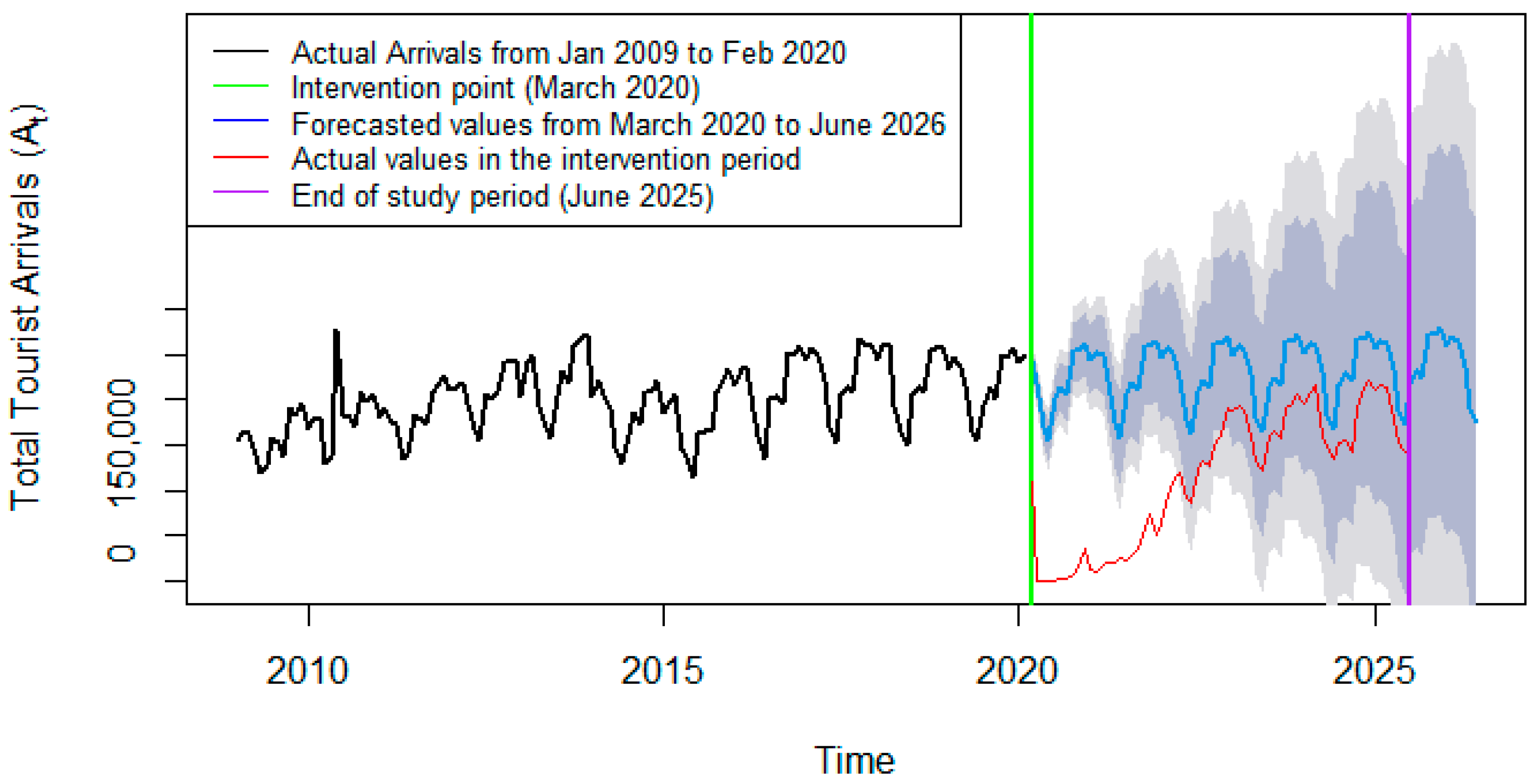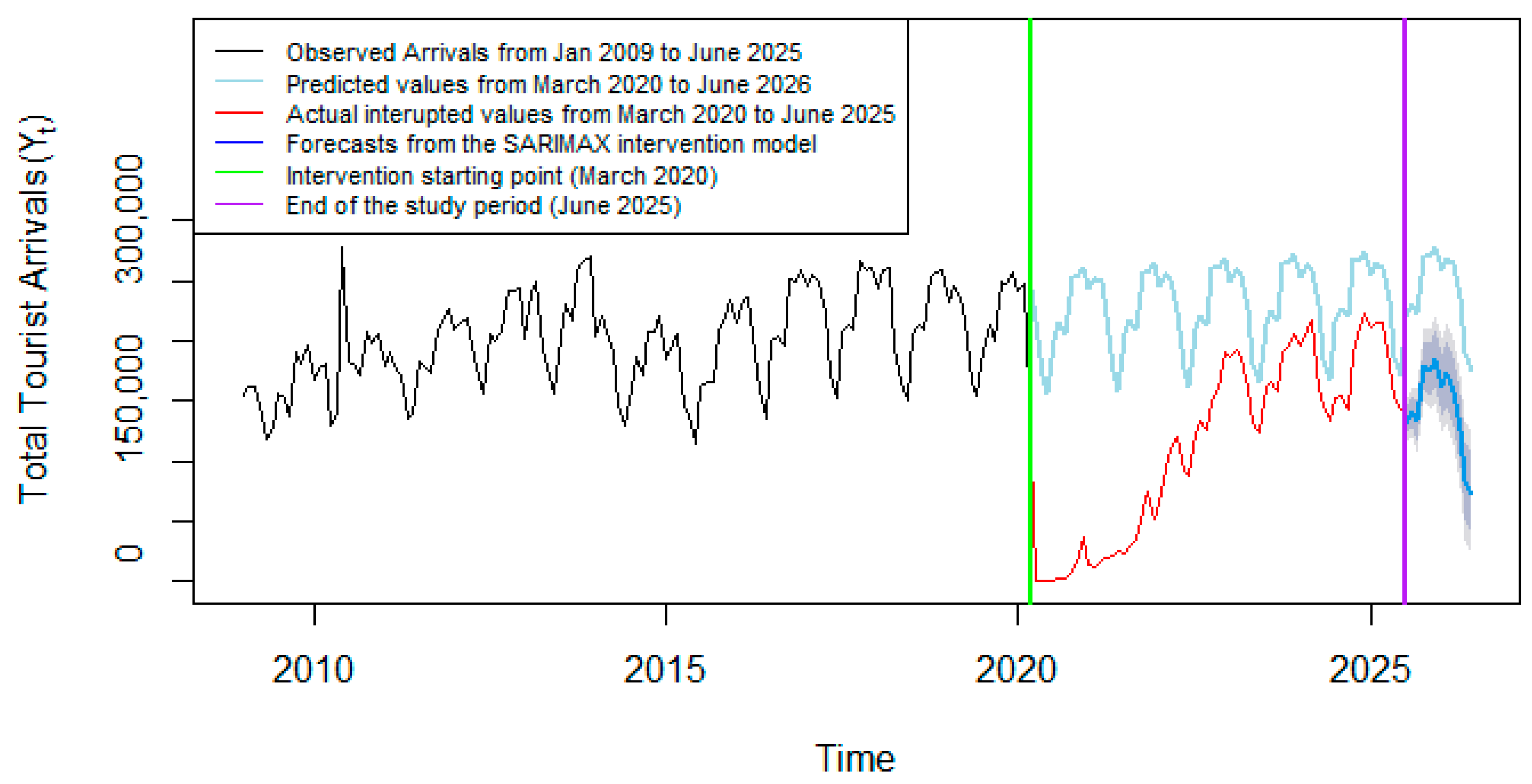 - Rianda, F., & Usman, H. (2023). Forecasting tourism demand during the COVID-19 pandemic: ARIMAX and intervention modelling approaches. BAREKENG: Jurnal Ilmu Matematika dan Terapan, 17(1), 285–294. [Google Scholar] [CrossRef]