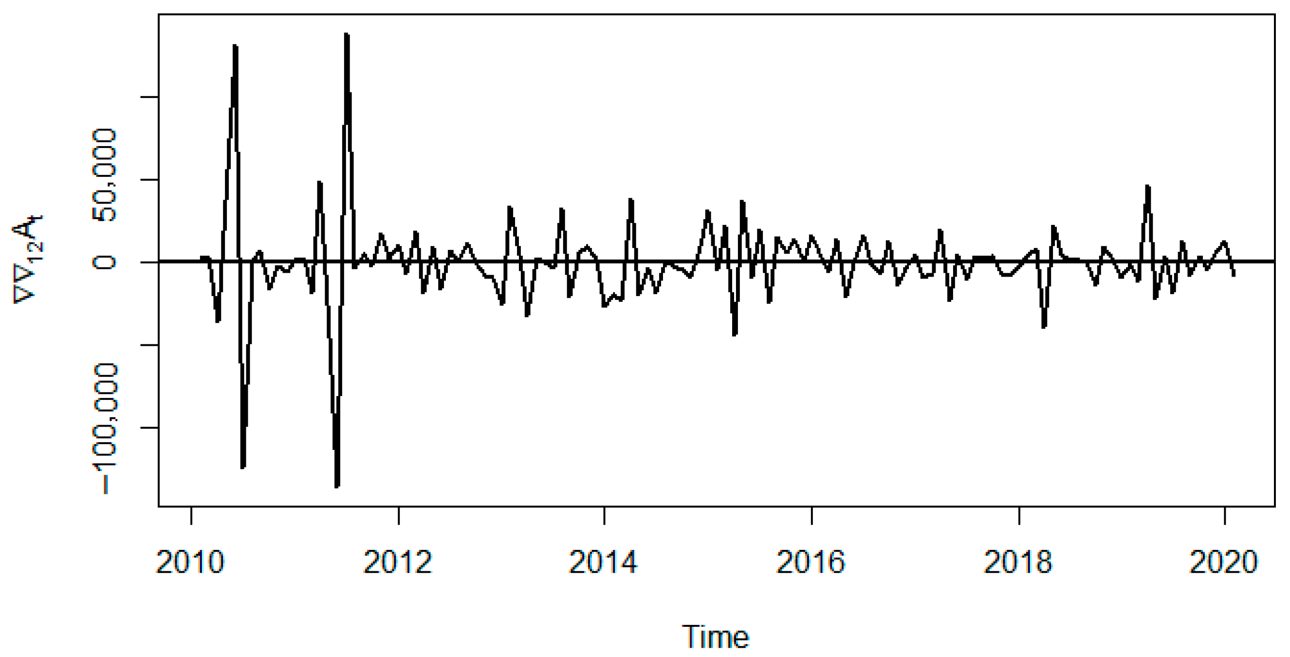 - Ahmar, A. S., Guritno, S., Rahman, A., Minggi, I., Tiro, M. A., Aidid, M. K., Annas, S., Sutiksno, D. U., Ahmar, D. S., Ahmar, K. H., & Ahmar, A. A. (2018). Modeling data containing outliers using ARIMA additive outlier (ARIMA-AO). Journal of Physics: Conference Series, 954, 012010. [Google Scholar] [CrossRef]