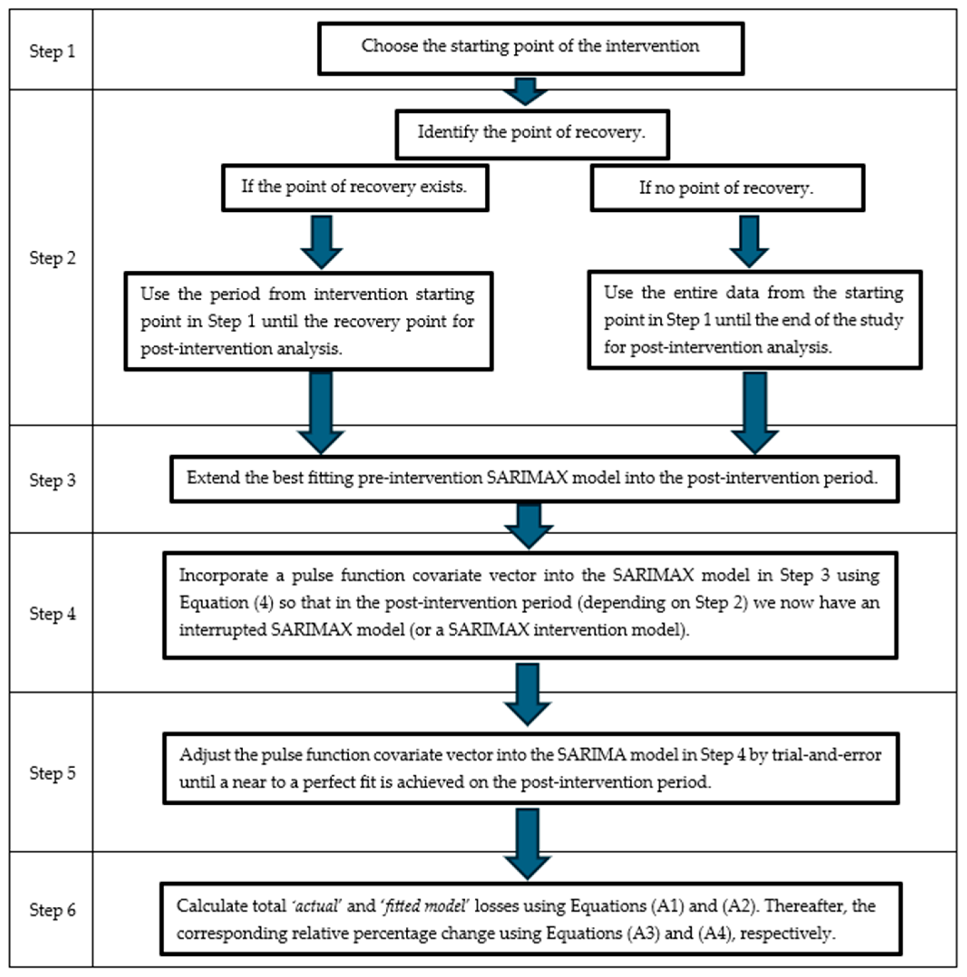 - The SARIMAX intervention model in Step 4 and Step 5 is then used to calculate estimated losses in the intervention period.