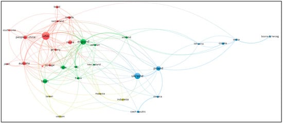 In addition, the bibliometric analysis was realised by VOSviewer version 1.6.20 to prove the significance of the solved issue. The method is used to provide quantitative analysis of published documents (). This search query was used in Web of Science: “business efficiency” (Topic) or “business activity” (Topic) or “activity ratio” (Topic) and Economics (Web of Science Categories) or Business (Web of Science Categories) or Management (Web of Science Categories) or Business Finance (Web of Science Categories) and Article (Document Types). The targeted issue yielded 1385 related articles. Figure 1 represents a bibliometric map of 32 dominant countries involved in this issue (each country published at least 15 articles). This led to the creation of four clusters of cooperating countries within business efficiency. Hungary, as a part of the Visegrad Four, is not included, but Slovakia, Czechia, and Poland are included. The red cluster dominates the map, connecting the USA, China, Australia, Germany, Canada, Brazil, Portugal, South Korea, Switzerland, Finland, Japan, and Russia. The green cluster includes the remaining developed European countries that are historically or economically connected to themselves or with others from the cluster, including England, France, Italy, Spain, Scotland, New Zealand, India, and Pakistan. Malaysia, Indonesia, Vietnam, and Taiwan represent close Asian cooperation in the yellow cluster. Slovakia, Czechia, and Poland, along with Ukraine, Lithuania, Croatia, Serbia, and Bosnia and Herzegovina, form a blue cluster of post-Soviet cooperation.