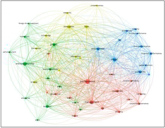 VOSviewer also created the bibliometric map of keyword occurrence (Figure 2). Each keyword must be marked at least 20 times in used articles. Four clusters were detected. The red cluster concentrates on the overall management and performance of business efficiency, encompassing aspects such as returns, governance, models, risk, and market. The blue one illustrates the financial aspect of business efficiency, encompassing factors such as profitability, financial performance, capital structure, and productivity. Business potential is defined by a yellow cluster that includes strategy, innovation, knowledge, sustainability, technology, etc. The last cluster is the green one that is related to this article and maps business activity through entrepreneurship, the effect of economic growth, foreign direct investments, and crisis periods, as well as COVID-19 consequences.