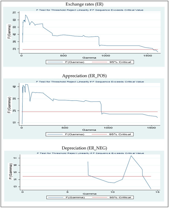 The threshold regimes of exchange rates are presented by parameters which will outline the lower and upper regimes. In the interest of the analysis, the study will have multiple threshold estimates (), namely exchange rates (ER), appreciation (ER_POS), and depreciation (ER_NEG), which are shown in Equations (4)–(6). To track fluctuations in the exchange rates, appreciation and depreciation series were used. The variable signifies the currency’s increase in value, while the variable denotes its decline in value. The hypothesis of the threshold must be determined and be significant. The non-linearity hypothesis of a threshold is written as follows: