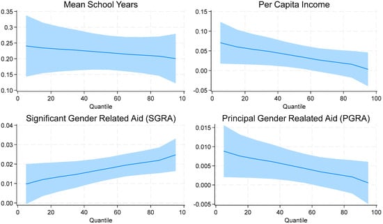Comparing the observed effect, while increased SGRA and PGRA inflows positively affect the WBL Index, SGRA has a more consistent and more considerable impact, especially at the higher end of the quantiles. For instance, at the 95th quartile, a 1% increase in the SGRA is associated with a 0.022% increase in the WBL Index. The corresponding effect of PGRA is not statistically discernible, indicating that SGRA is more effective for comprehensive improvements in gender-related business and law conditions affecting women. Conversely, the observation that PGRA significantly impacts the WBL Index at the lower to middle quantiles indicates that perhaps complementary measures are needed to enhance its effectiveness across countries at various ends of the legal and regulatory contexts. To aid visual observation of the patterns of the observed effects, Figure 1 presents the visualization of the coefficients of the SGRA and PGRA along with that of mean years of schooling and per capita income.