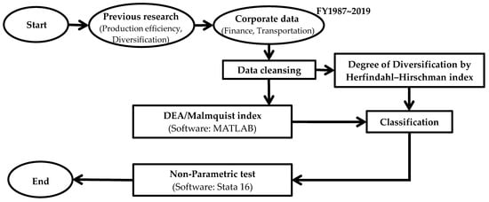 Figure 1 illustrates the framework used in this study. First, a conventional DEA model is used to calculate the production efficiency of railroad operations. It measures the impact of decision-making units (DMUs), railroad companies in this study, and determines their degree of efficiency. The degree of diversification is then calculated, and we classify companies using each company’s segmental financial data. Finally, a non-parametric rank sum test verifies the relationship between the efficiency values obtained by the DEA and the degree of diversification. Combining the DEA model and non-parametric statistical tests is useful for empirical research on the performance evaluation of major PRCs.