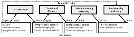 This study defines the inputs and outputs used in DEA with reference to Sakamoto (1997), who analyzed the efficiency of Japanese third-sector railroads. Concretely, we classify the business activities of railroad companies into four phases and combine them to stipulate inputs and outputs in DEA to examine four efficiency measures: cost efficiency, operational efficiency, revenue-earning efficiency, and profit-earning efficiency. The data in this study are summarized in Table 1. Table 2 summarizes the input and output combinations of four efficiency measures, and Figure 2 describes the four phases from (a) to (d) and the variables to calculate the four efficiency measures.