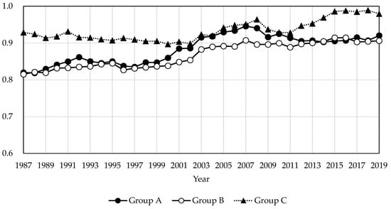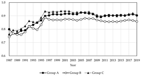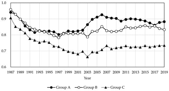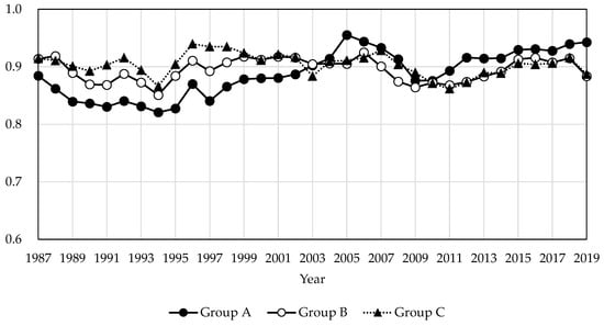 Profit-earning efficiency has shown a mixed trend of increasing and decreasing. Group A was the highest among the three groups in 2019, while it was the lowest in 1987. The efficiency values of Group A range from 0.8843 to 0.9428. Although Group A’s operating revenues tended to be smaller than those of Group C, the relatively high reduction in labor costs and other factors may have contributed to the superior results in Group A. Companies in Group A have a relatively high degree of diversification.