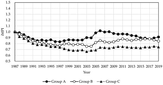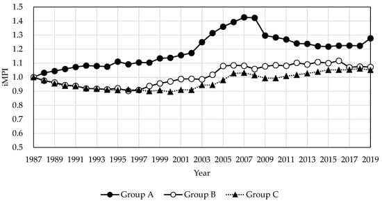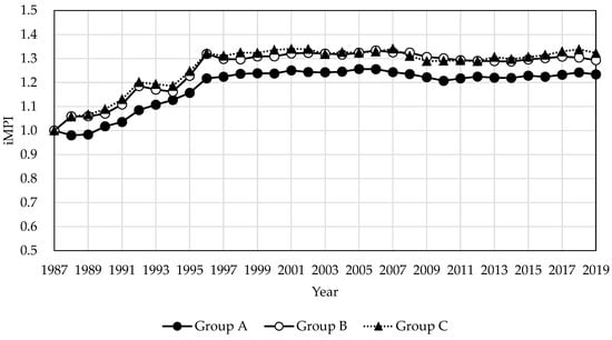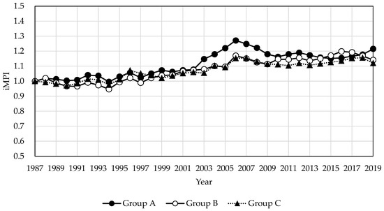 The MPI is defined based on the distance function, as shown in Section 3.3, Equations (4) and (5). the Malmquist index measures the degree of changes in productivity over time. Here, for descriptive convenience, we define the “inverse MPI (iMPI) = 1/MPI” and present the iMPI results in Figure 7, Figure 8, Figure 9 and Figure 10. By this definition, it is easy to understand that in these figures, when the measure of the iMPI is equal to or larger than 1, productivity is status quo or increasing, while when it is less than 1, productivity is decreasing. Figure 7, Figure 8, Figure 9 and Figure 10 show the results of the change in the iMPI for the three groups classified by the degree of diversification, with 1987 as the base year with unity.