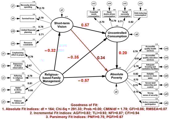 This study found that short-term vision and uncontrolled consumption serve as significant intervening variables in the relationship between religious-based family management (RBFM) and absolute poverty, with a negative indirect effect of −0.21. These findings align with prior research suggesting that RBFM enhances financial behavior by instilling values such as discipline, patience, and prudent financial planning (; ). By reducing tendencies toward impulsive consumption and shifting focus from immediate needs to long-term goals, RBFM mitigates the adverse effects of short-term vision ().