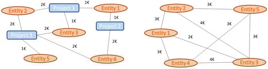 Illustrative example of a 2-mode network of entities and projects and its associated 1-mode network of entities and its corresponding weights.