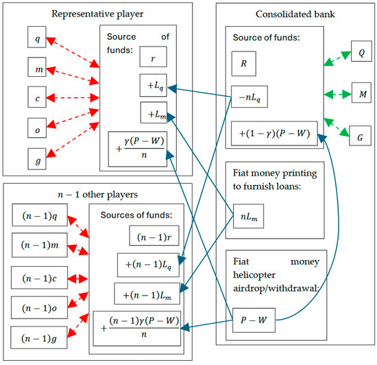 Figure 1 shows the flows of funds between the bank and the players, distinguishing between the representative player and the other players. The flows of funds are shown with blue one-way solid arrows, i.e., hard money loans from the bank’s source of funds, fiat money loans printed by the bank, and fiat money helicopter airdrop/withdrawal, which the bank also allocates/withdraws to/from its own source of funds. The five red dashed two-way arrows show how the representative player allocates its source of funds (the left-hand side of (1)) into its assets (the right-hand side of (1)), choosing its six variables , and . The setup is analogous for the other players. The three green dashed two-way arrows show how the bank allocates its source of funds (the left-hand side of (5)) into its assets and (the right-hand side of (5)), choosing its three variables , and -.