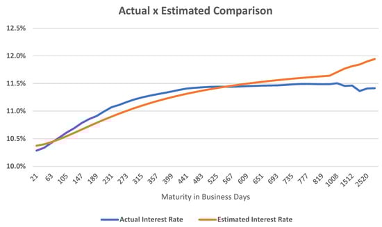 The key components presented at Table 8 are the macroeconomic variables. It can be observed that the Selic rate was 10.90% per annum (10.35% in continuous terms), the exchange rate was an average of BRL 2.455/USD, the weekly variation was BRL 0.0608/USD, the CDS spread was 173.05 basis points, the inflation expectation was 6.31% (Focus Bulletin), the weekly change increased in 0.01 percentage points, and the GDP expectation was 0.92% (Focus Bulletin). The sensitivity testing showed how the yield curve responds to macroeconomic changes; moreover, it demonstrates the model’s predictive capabilities, and it validated theoretical relationships between variables.