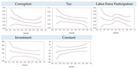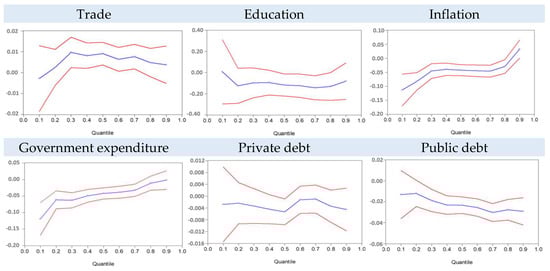 On the other hand, there are several panel data studies that used the quantile regression approach, for example, (), (), (), (), (), (), (), (), (), (), (), and (). () studied the relationship between public debt, governance, and economic growth with heterogeneous panel data in 44 developing countries for the period 1990–2000 using the quantile via moments approach. () studied the impact of renewable energy, internet usage, and foreign direct investment on carbon dioxide emissions in 10 developing countries for the period 1996–2015 using quantile moment regression. However, there is not much literature that examines the effects of public debt on economic growth.