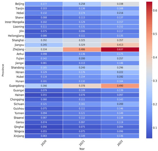 1. Overall data. By measuring the digital village construction measurement of 30 provinces in China from 2012 to 2022, the involvement and differences of various regions in the digitalization process can be intuitively displayed. The data show apparent high and low differences in the level of digital village construction between the eastern region and the central and western regions, and the overall migration process remains upward. In the heat map, the color changes from dark blue to dark red, representing the index change from low to high values.