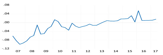 Regarding residential property prices, Figure 5 shows an upward trend in housing price inflation during the period 2007–2017. Although “The Global Housing Watch” by the International Monetary Fund considers the real price growth of residential properties in Morocco to be among the lowest in the world, this variation warrants an evaluation and analysis of the ability of the economic policies implemented in this country to control these fluctuations.
