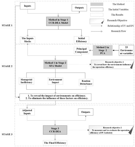 Based on the research gap, the study had two primary objectives: first, to accurately measure the operational efficiency of the PI in both the financial and innovation dimensions and, second, to reveal the impact of comprehensive environmental factors on operational efficiency. To achieve these research objectives, the study employed a combined method of three-stage DEA and PCA. The process can be divided into three stages.