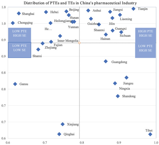 In the first stage, efficiency measurement was conducted using DEAP 2.1, based on the input-oriented BCC model. The detailed results of the measurement are presented in Table 3. Technical efficiency (TE) is a comprehensive measure of the PI in a region’s ability of efficiency in resource allocation and utilization, while pure technical efficiency (PTE) reflects the production efficiency influenced by factors such as management and technology. Scale efficiency (SE) assesses the impact of scale factors on production efficiency. The overall TE of the sample enterprises, referred to operation efficiency in the region, is the product of PTE and SE.